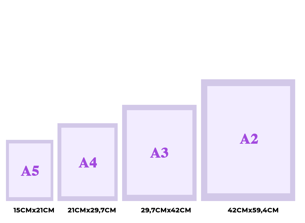 A5 (15 x 21 cm), A4 (21 x 29,7 cm), A3 (29,7 x 42 cm) en A2 (42 x 59,4 cm).